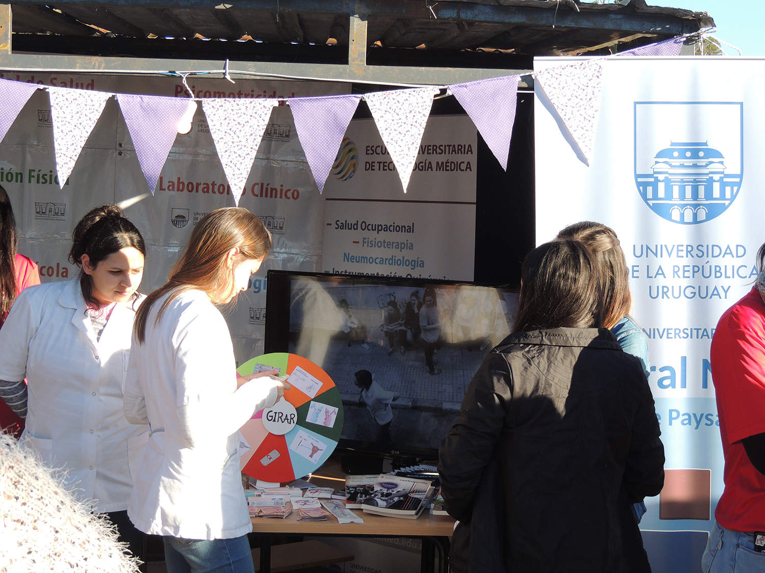Por la tarde estuvieron las compañeras de la Unidad de Extensión informando acerca de los llamados concursables a fondos de extensión universitaria; un numeroso grupo de la carrera Técnico en Hemoterapia liderado por las docentes realizó una actividad de información y sensibilización en el marco del día mundial del donante voluntario de sangre y estudiantes y docentes de la Licenciatura Binacional de Obstetricia realizaron una actividad de difusión de métodos anticonceptivos.
