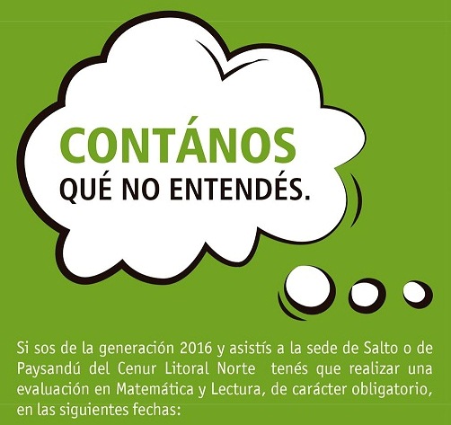 Tanto el perfil de ingreso como las pruebas diagnósticas son OBLIGATORIAS para la generación que ingresa (2016) y se realizan a través de la plataforma EVA en el espacio "EVALUACIÓN DIAGNÓSTICA Y CUESTIONARIO DE PERFIL DE INGRESO / 2016” alojado en Interior/Centro Universitario Regional Litoral Norte / Sede Paysandú/ ED y Perfil de Ingreso.