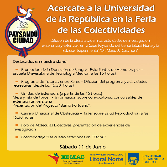 Te esperamos el sábado 11 de junio desde las 10 y hasta las 18 horas en Plaza Artigas, con difusión de la oferta académica, actividades de investigación, enseñanza y extensión de la Sede Paysandú del Cenur Litoral Norte y la Estación Experimental “Dr. Mario A. Cassinoni”