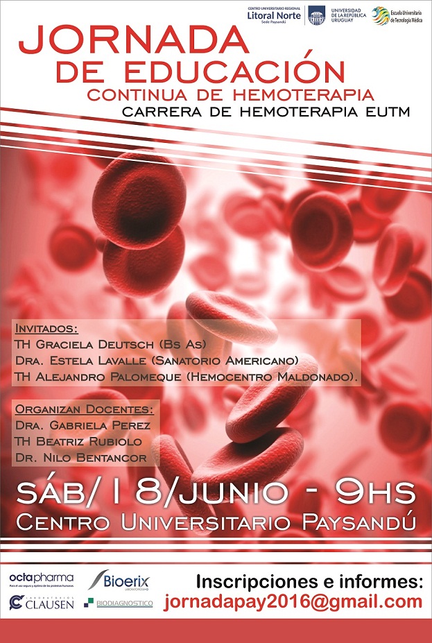 Desde la Tecnicatura en Hemoterapia de la Escuela Universitaria de Tecnología Médica, Sede Paysandú, se invita a la Jornada de Educación Continua de Hemoterapia, a desarrollarse el sábado 18 de junio de 9 a 18:30 horas en la Sede Paysandú del Cenur Litoral Norte- Udelar.