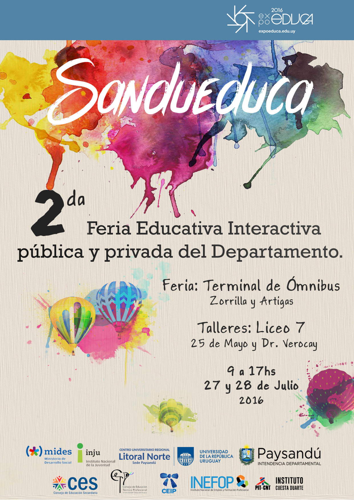 En la Terminal de ómnibus, la 2da Sandueduca reunirá más de 30 stanes con información sobre opciones de enseñanza, pública y privada, formal y no formal de Paysandú. La feria se realizará este mièrcoles 27 y jueves 28 de julio de 9 a 17 horas y en simultaneo se realizarán talleres participativos de información en las instalaciones del Liceo Nº 7.