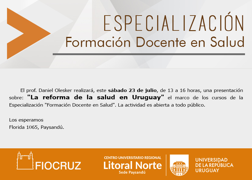 Este sábado 23 de julio de 2016, el prof. Daniel Olesker brindará una charla sobre la Reforma de Salud en Uruguay. La invitación a Olesker se realizó en el marco de la realización en la Sede Paysandú del Cenur Litoral Norte de la Universidad de la República de la Especialización "Formación Docente en Salud" a través del convenio con la Escuela Politécnica de Salud Joaquim Venancio (EPSJV) de la Fundación Oswaldo Cruz FIOCRUZ de Brasil. La charla se realizará en el aulario de la Sede, Florida 1065, de 13 a 16 horas.