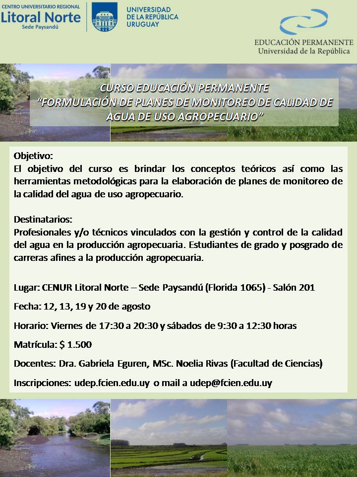 El objetivo del curso es brindar los conceptos teóricos así como las herramientas metodológicas para la elaboración de planes de monitoreo de la calidad del agua de uso agropecuario.