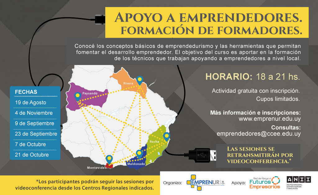 Este taller es organizado por Emprenur y la Unidad de Perfeccionamiento y Actualización de Egresados (UPAE) de la Facultad de Ciencias Económicas y de Administración y cuenta con la colaboración del Programa de Apoyo a Futuros Empresarios de la Agencia Nacional de Investigación e Innovación (ANII) en el marco de su proyecto de apoyo a emprendedores.