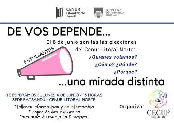 Compartimos invitación a la actividad "DE VOS DEPENDE", organizada por el Centro de Estudiantes de la sede Paysandú (CECUP) y que se desarrollará el próximo lunes 04 de junio a las 16 horas en la sede universitaria. La misma tendrá como tematica central, informar sobre las elecciones que se llevarán a cabo el 06 de junio, en el Cenur Litorla Norte y la participación es abierta y extendida a todos los ordenes y a la comunidad universiraria, en el entendido de que las elecciones del próximo 06 de junio son competencia de tod@s