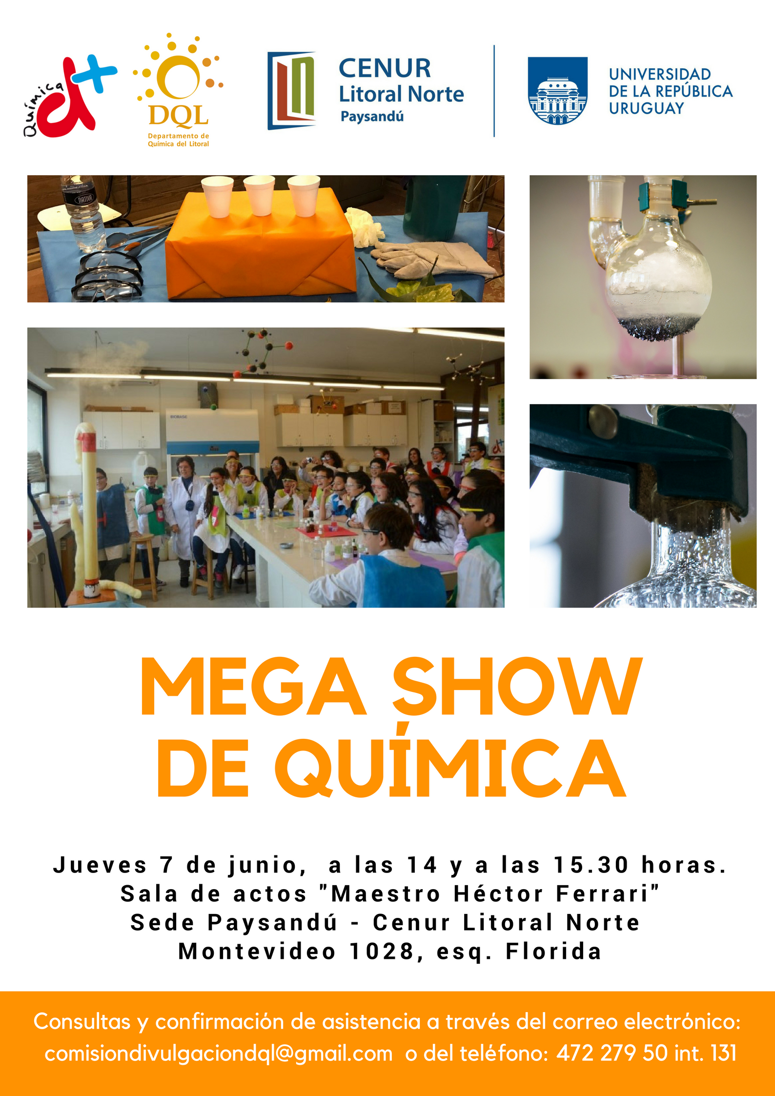 Desde el Departamento de Química del Litoral (DQL) se invita dos shows de reacciones que se realizarán en la sala de actos "Maestro Héctor Ferrari" de la Sede Paysandú del Cenur Litoral Norte el próximo jueves 7 de junio a las 14 y a las 15:30 horas. Ya han confirmado asistencia delegaciones de varias escuelas y se invita especialmente a hijos de funcionarios y docentes de la Universidad de la República para que puedan disfrutar del show.