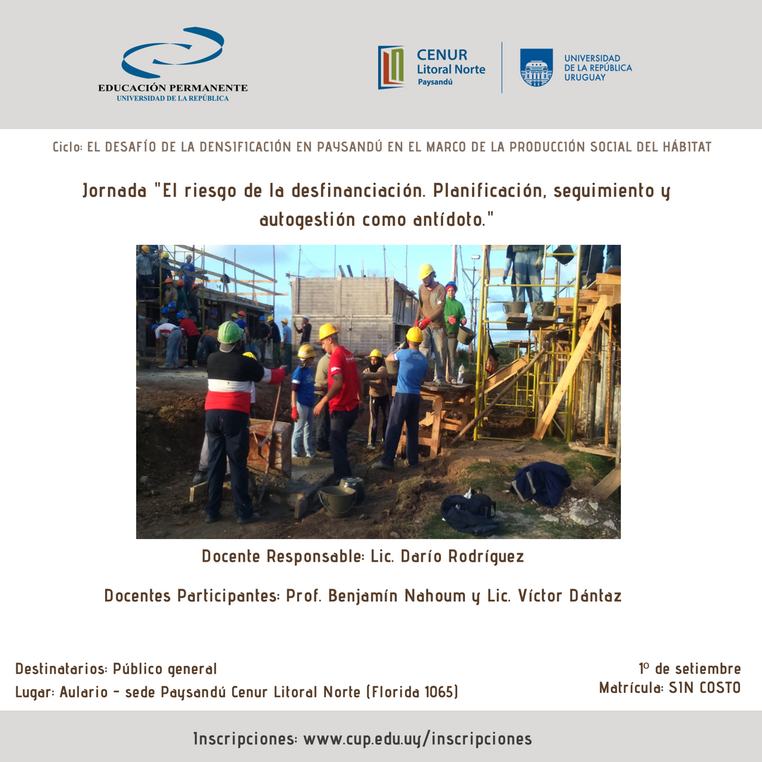 Desde la Unidad de Educación Permanente de la sede Paysandú del Cenur Litoral Norte se invita a participar de la Jornada: El riesgo de la desfinanciación. Planificación, seguimiento y autogestión como antídoto. a desarrollarse en la sede universitaria el próximo sábado 1° de setiembre. La misma es una actividad que se enmarca en el Ciclo: EL DESAFÍO DE LA DENSIFICACIÓN EN PAYSANDÚ EN EL MARCO DE LA PRODUCCIÓN SOCIAL DEL HÁBITAT