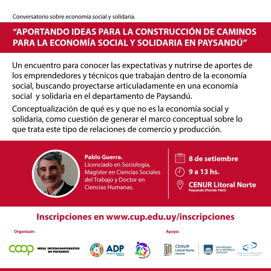 Desde la Unidad de Educación Permanente de la sede Paysandú del Cenur Litoral Norte se invita a participar del Conversatorio sobre economía social y solidaria: APORTANDO IDEAS PARA LA CONSTRUCCIÓN DE CAMINOS PARA LA ECONOMÍA SOCIAL Y SOLIDARIA EN PAYSANDÚ. La actividad se desarrolará en el Aula Magna, de la sede Paysandú (Florida 1065), del Cenur Litoral Norte, el próximo sábado 8 de setiembre de 9 a 13 horas, con entrada gratuita.