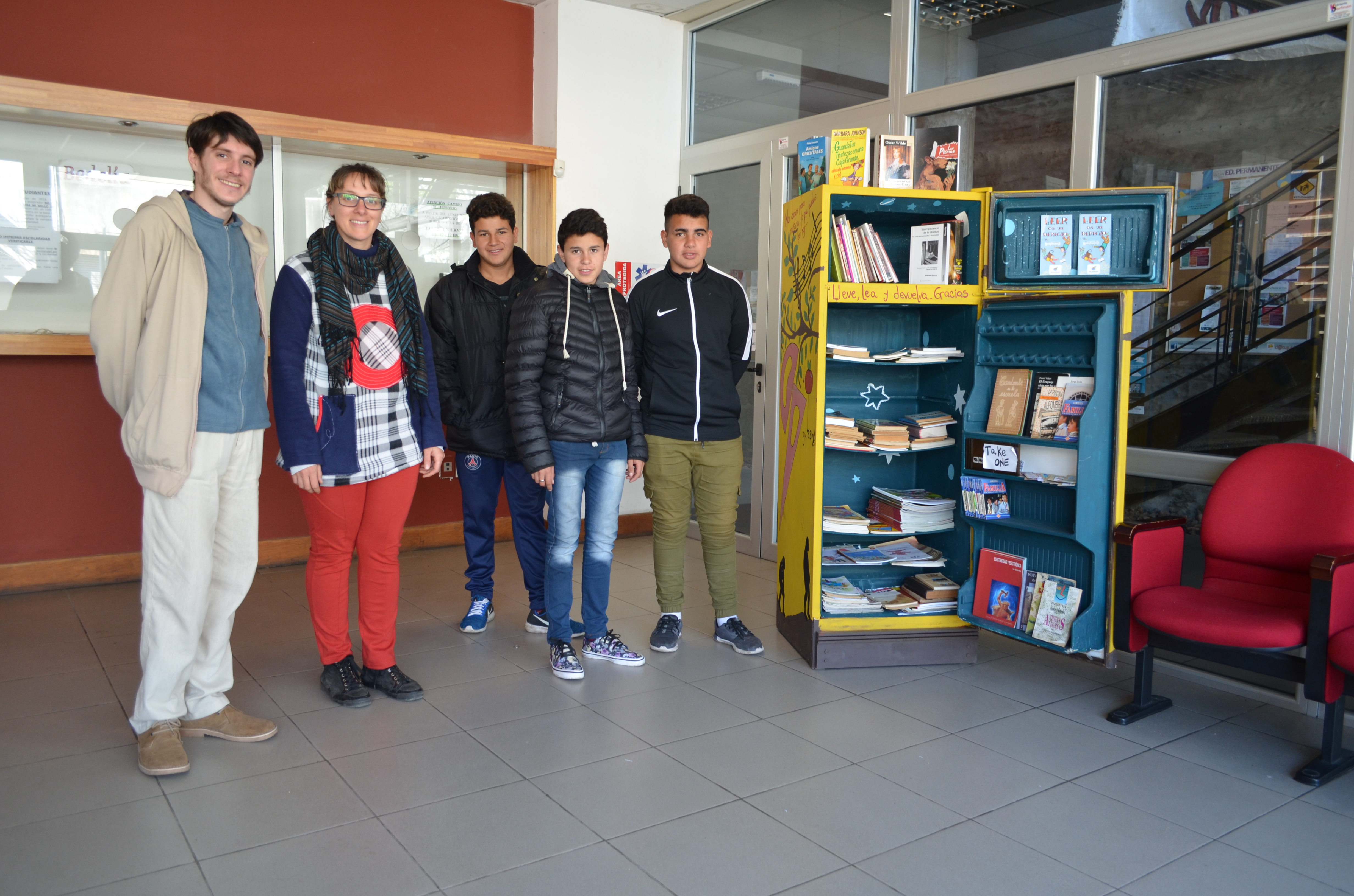 Mayra Migliónico educadora del programa junto a los estudiantes Juan Olivera, Lucas Gomez y Jean Rivero participaron de la instalación de la biblioheladera. Luego realizaron una recorrida por la sede universitaria y recabaron información sobre la oferta académica con la guía del docente de la Unidad de Apoyo a la Enseñanza (UAE) Rodrigo Eugui.