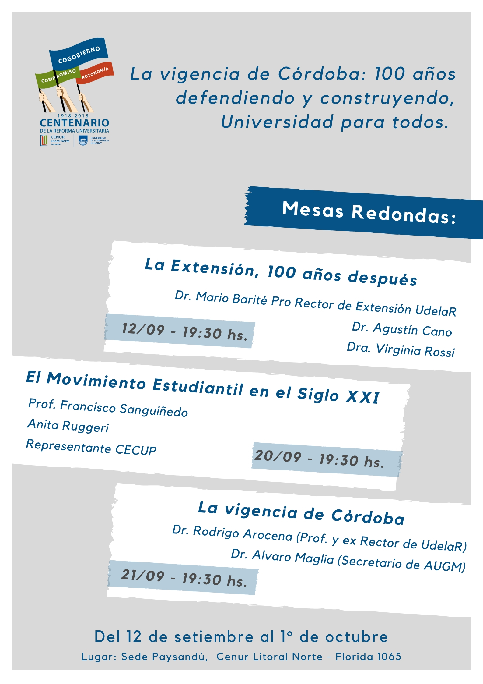 En el marco de los 100 años de la Reforma Universitaria en Córdoba (Argentina), el Consejo del Centro Universitario Regional (Cenur) Litoral Norte adoptó dos resoluciones de relevancia en referencia a resaltar la Conmemoración de los 100 años de la Reforma de Córdoba de 1918. En primer término resolvió la creación de una comisión ad-hoc que organizará actividades abiertas a la comunidad universitaria de toda la región y además aprobó la producción de una imagen conmemorativa que acompañará las comunicaciones oficiales. Dicha imagen fue desarrollada por la docente Alejandra Suárez.