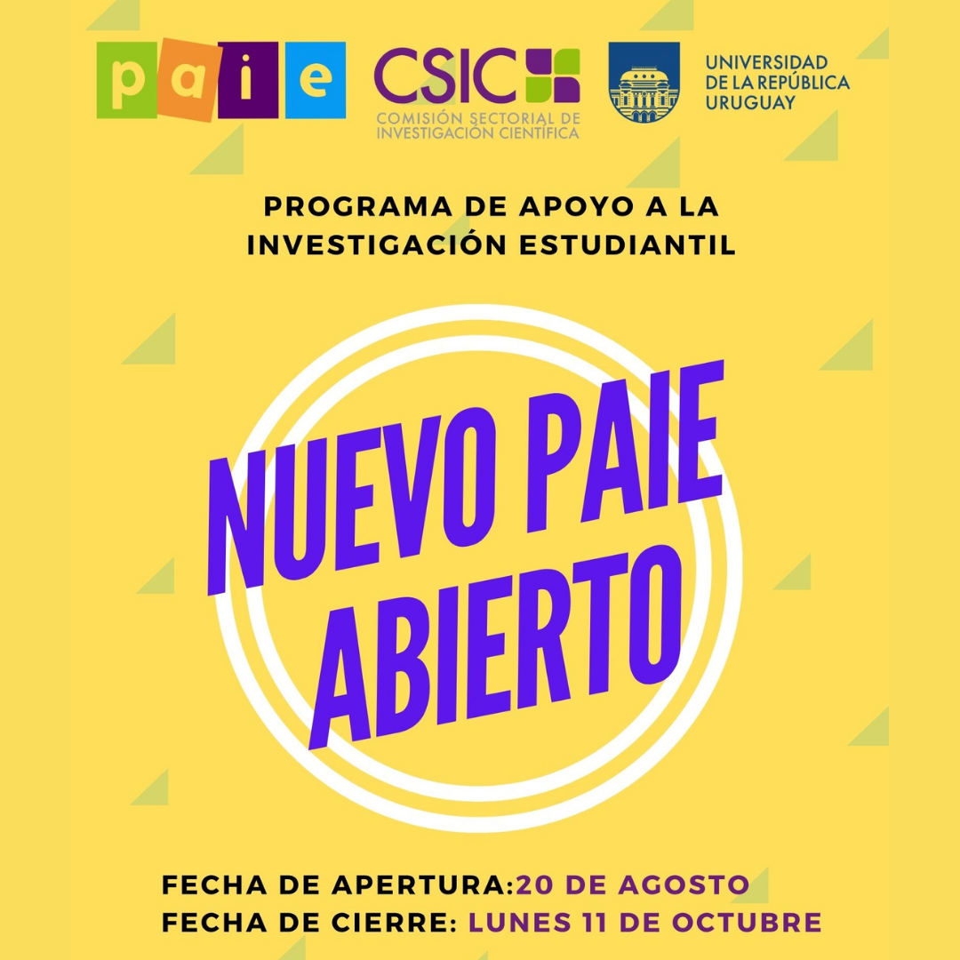 Están disponibles las bases 2021 del Programa de Apoyo a la Investigación Estudiantil (PAIE) de la Comisión Sectorial de Investigación Científica (CSIC). El PAIE tiene por objetivo brindar la oportunidad de desarrollar proyectos de investigación a equipos de estudiantes universitarios de grado. En tal sentido, se pretende fomentar la creatividad y la inquietud de los estudiantes de grado mediante la realización de pequeños proyectos de investigación originales que pongan en práctica sus propias ideas. Se espera que este programa, que otorga apoyos significativos a escala de una investigación de estudiantes, brinde oportunidades para que los jóvenes experimenten por primera vez sus propias ideas.