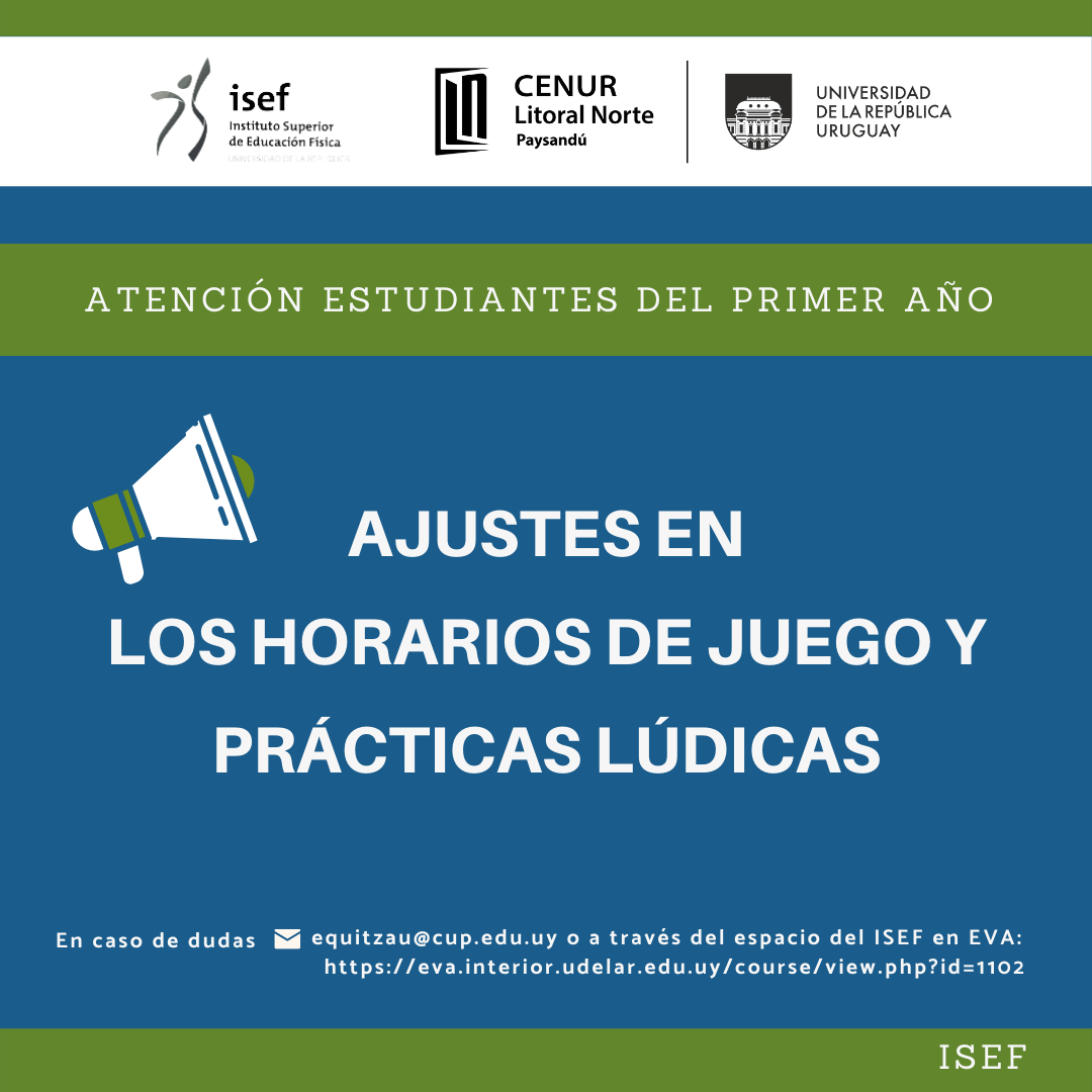 Desde la coordinación del Instituto Superior de Educación Física en sede Paysandú se informa a los estudiantes del primer año ajustes en los horarios de Juego y Prácticas Lúdicas, debido a cambios en el equipo docente de esta unidad curricular.