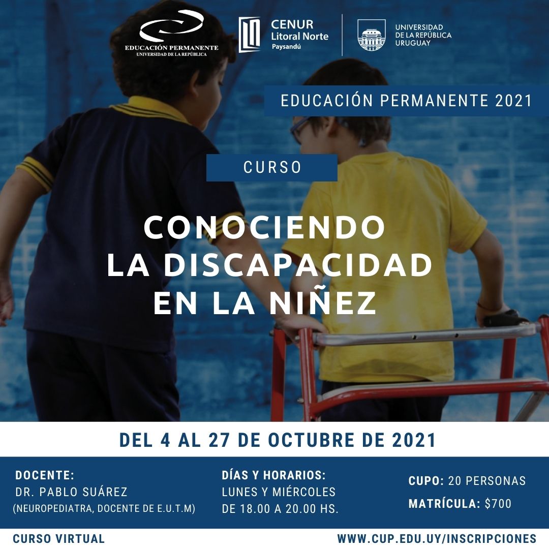 Desde la Unidad de Educación Permanente de la sede Paysandú del Cenur Litoral Norte se invita a participar del curso "CONOCIENDO LA DISCAPACIDAD EN LA NIÑEZ" , el cual se realizará presencialmente del 4 al 27 de octubre de 2021.