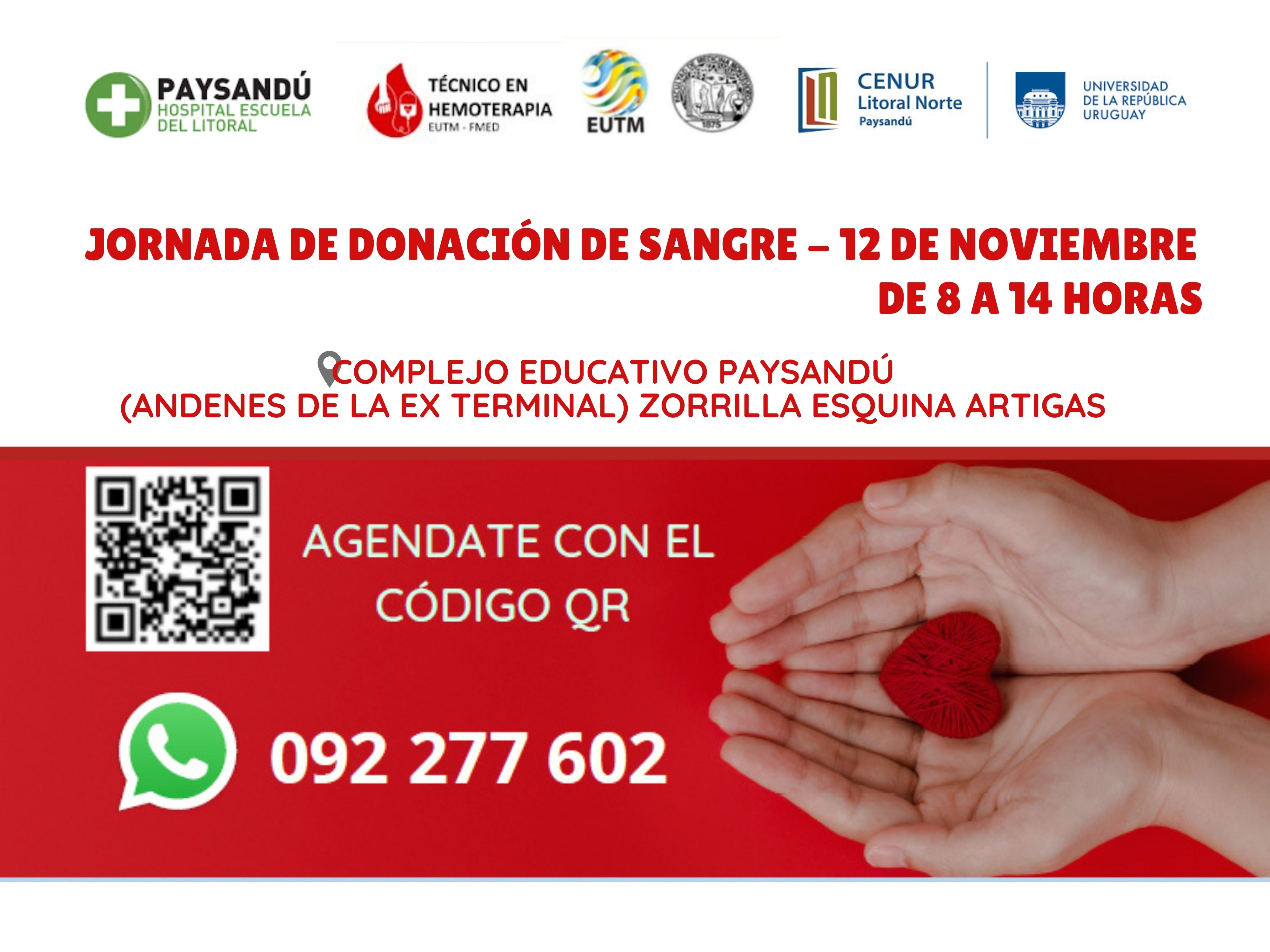 La Tecnicatura en Hemoterapia de la Escuela Universitaria de Tecnología Médica (Eutm) de la Facultad de Medicina en la sede Paysandú, del Centro Universitario Regional (Cenur) Litoral Nortel llevará adelante una jornada de donación de sangre el próximo 12 de noviembre de 2021.