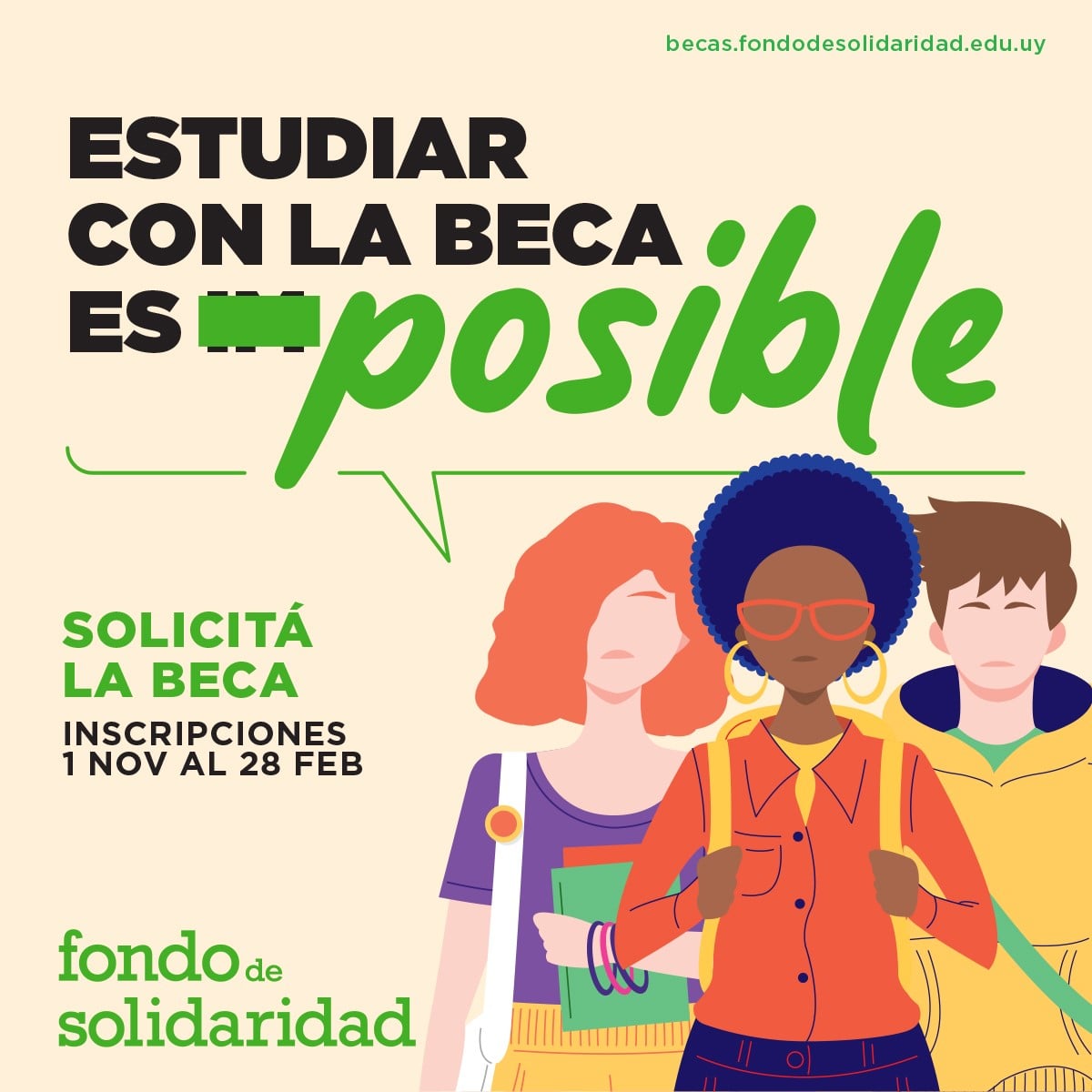 Desde el 1º de noviembre hasta el 28 de febrero recibimos las inscripciones para jóvenes aspirantes a las becas 2022 del Fondo de Solidaridad, toda la solicitud se realiza en línea en Autogestión del Portal  https://becas.fondodesolidaridad.edu.uy/inscripciones-becas-2022/