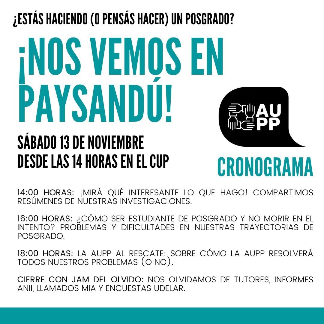 El sábado 13 de noviembre de 14 a 18horas en la sede Paysandú del Centro Universitario Regional (CENUR) Litoral Norte, se desarrollará el 1er Encuentro de Estudiantes de Posgrado del CENUR Litoral Norte. Este primer encuentro forma parte de las actividades que realiza la Asociación Uruguaya de Posgraduandas y Posgraduandos (AUPP) www.somosaupp.uy