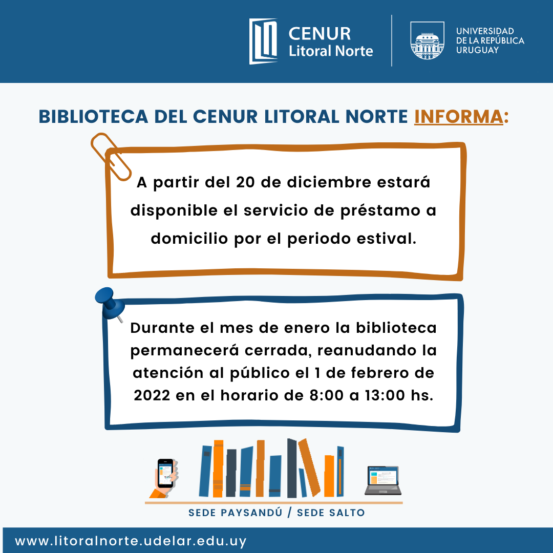 El Departamento de Documentación y Biblioteca del Cenur Litoral Norte informa que a partir del 20 de diciembre estrá disponible el servicio de préstamo a domicilio por el periodo estival en ambas sedes (Salto – Paysandú).