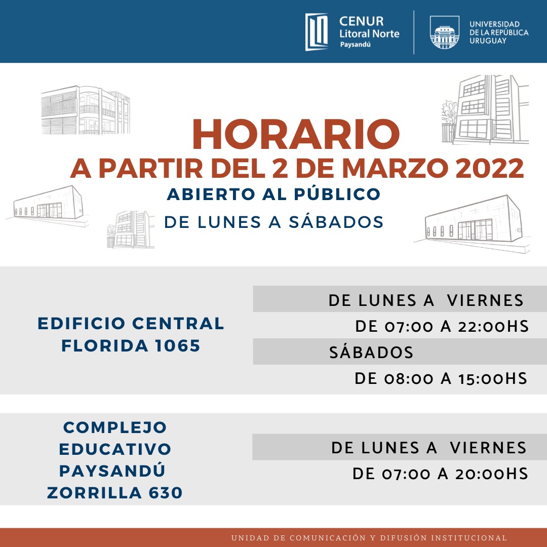 A partir del 2 de marzo de 2022 los horarios de apertura de los edificios de la Sede Paysandú, Centro Universitario Regional (Cenur) Litoral Norte serán los siguientes: