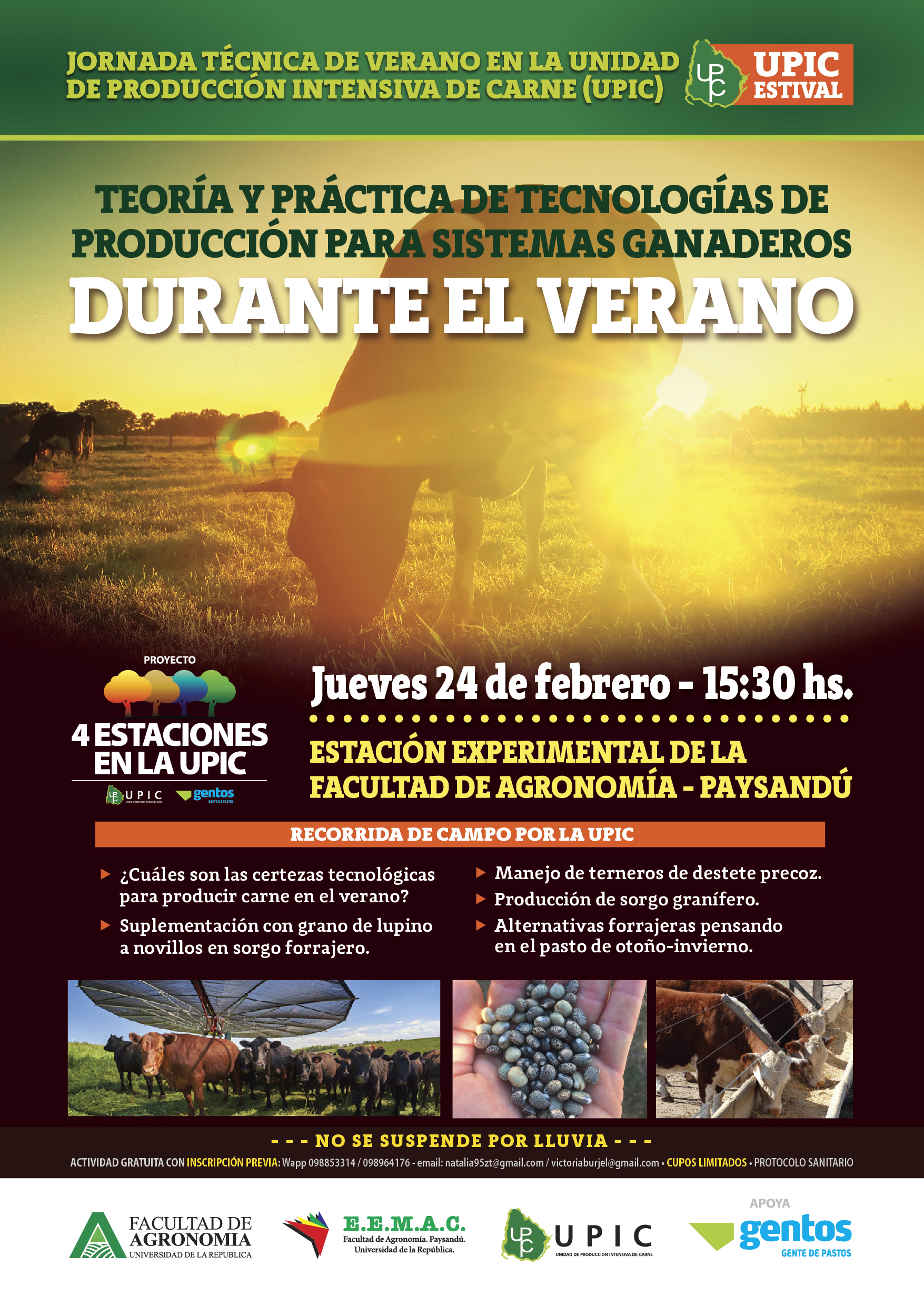 Jornada de Verano de la UPIC realizar el jueves 24 de febrero, a la 15:30 horas en la Estación Experimental Dr. Mario A. Cassinoni (Paysandú). La misma será una jornada gratuita con inscripción previa dado que los cupos son limitados por protocolo sanitario.
