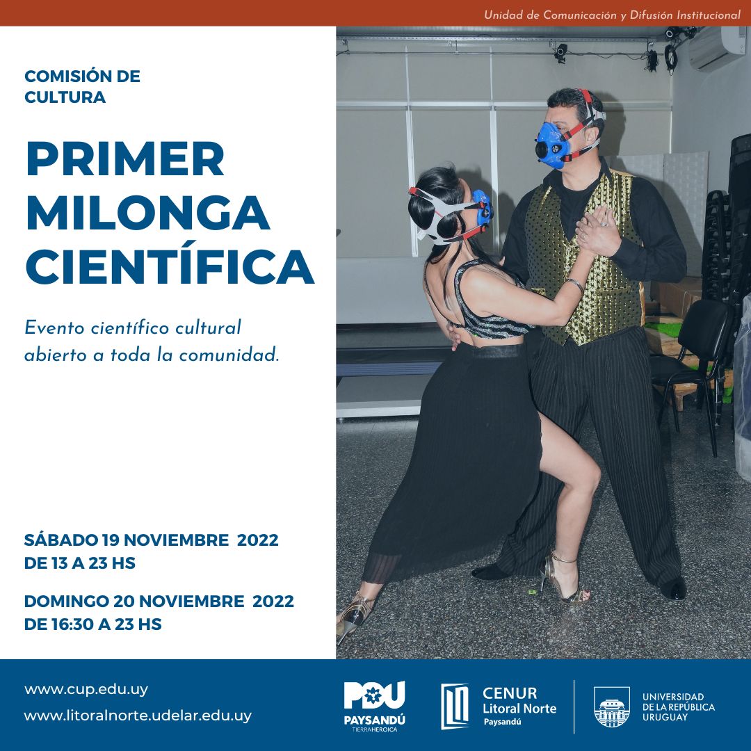 Paysandú será sede la Primer Milonga Científica, un evento de dos días en el que se desarrollarán una serie de actividades culturales y de divulgación de investigación científica relacionada al tango. El sábado 19 y domingo 20 de noviembre de 2022 se llevarán adelante una serie de actividades sociales y de difusión relacionadas a la investigación biomecánica. El programa previsto es organizado por la sede Paysandú del Centro Universitario Regional (Cenur) Litoral Norte y la Intendencia de Paysandú. La propuesta combina en el programa el abordaje de aspectos como, la asociación entre la música del Tango y las acciones motoras de la vida diaria, la utilización del Tango como terapia en personas con afecciones motoras complejas, su utilidad como modelo de estudio en diferentes áreas de investigación. Además, se abordará el aprendizaje de su técnica dentro de los ritmos que contiene el género y su relevancia histórica y cultural. Las actividades de investigación tendrán lugar durante las mañanas en el Libiam (en el Complejo Educativo Paysandú), en donde se registrará la posición de marcadores colocados en el cuerpo de los bailarines participantes (15 en total), para realizar un análisis tridimensional y se registrará el consumo de oxígeno para estimar costo metabólico de durante la marcha del tango salón a velocidad autoseleccionada. Asimismo habrá actividades en diferentes espacios de la ciudad abiertos a todo público (consultar el Programa).