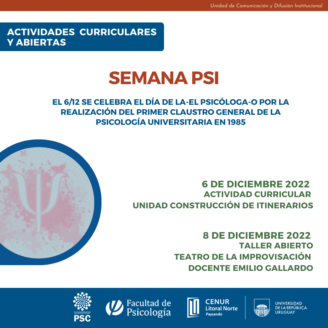 Asimismo el jueves 8 de diciembre, a las 19 horas, en el mismo marco del día del psicólogo, en el salón 205, se concretará una actividad abierta a estudiantes, docentes, funcionarios y egresados de la Licenciatura de Psicología a cargo del docente Emilio Gallardo, docente del área de Cultura del Servicio Central de Inclusión y Bienestar Universitario (Scibu). El taller de teatro de la improvisación se parte de que improvisar “es afrontar el riesgo, vencer el miedo, es tomar la decisión, es crear la aventura, transitarla y disfrutarla”.