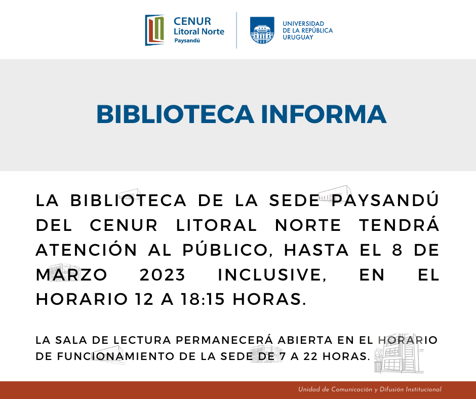 El Departamento de Documentación y Biblioteca del Cenur Litoral Norte en sede Paysandú informa que la atención al público hasta el 8 de marzo 2023 inclusive, será en el horario de 12.00 a 18:15horas.