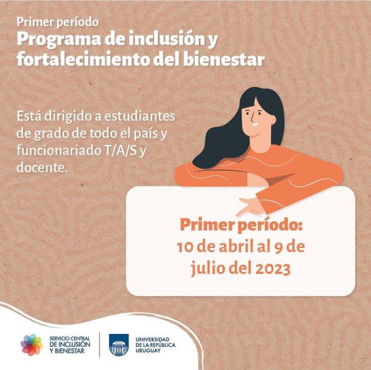 El Programa de Inclusión y Fortalecimiento del Bienestar tiene el propósito de fomentar el acceso pleno en igualdad de condiciones de todo el colectivo universitario al derecho a la educación, al trabajo y a la salud integral. Busca propiciar el acceso a prestaciones de bienes, servicios, que faciliten sortear las dificultades observadas, presentadas y/o sentidas en el transcurso de la trayectoria laboral o educativa en la Udelar.