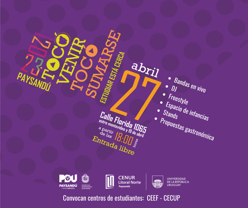 Este jueves 27 de abril, desde las 18 horas, frente a la sede universitaria en la calle Florida esquina Montevideo se desarrollará el festival universitario Tocó Venir en Paysandú donde la sede del Centro Universitario Regional (Cenur) Litoral Norte le da la bienvenida a estudiantes que comenzaron sus estudios en 2023.