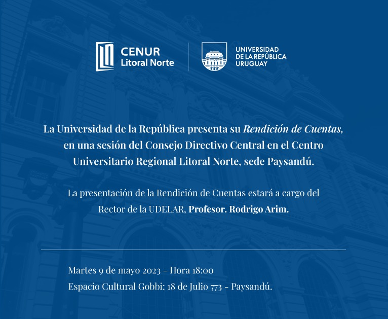 La Universidad de la República invita a la presentación de la Rendición de Cuentas 2022, a realizarse este martes 9 de mayo, en una sesión del Consejo Directivo Central en la sede Paysandú del Centro Universitario Regional Litoral Norte. En esta ocasión la Udelar, rinde cuentas acerca de lo actuado durante 2022, describe su desarrollo y señala los inconvenientes que enfrenta y para los que propone soluciones. A su vez, se pone a disposición para contribuir a la resolución de grandes desafíos nacionales.