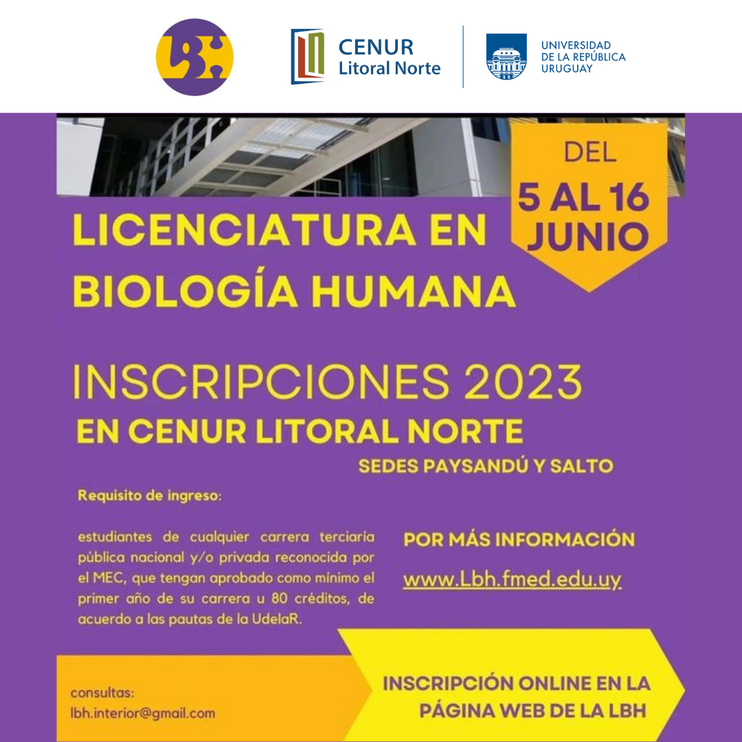 La Licenciatura en Biología Humana en el Cenur Litoral Norte (sedes Salto y Paysandú) abre inscripciones de 05 al 16 de junio 2023.