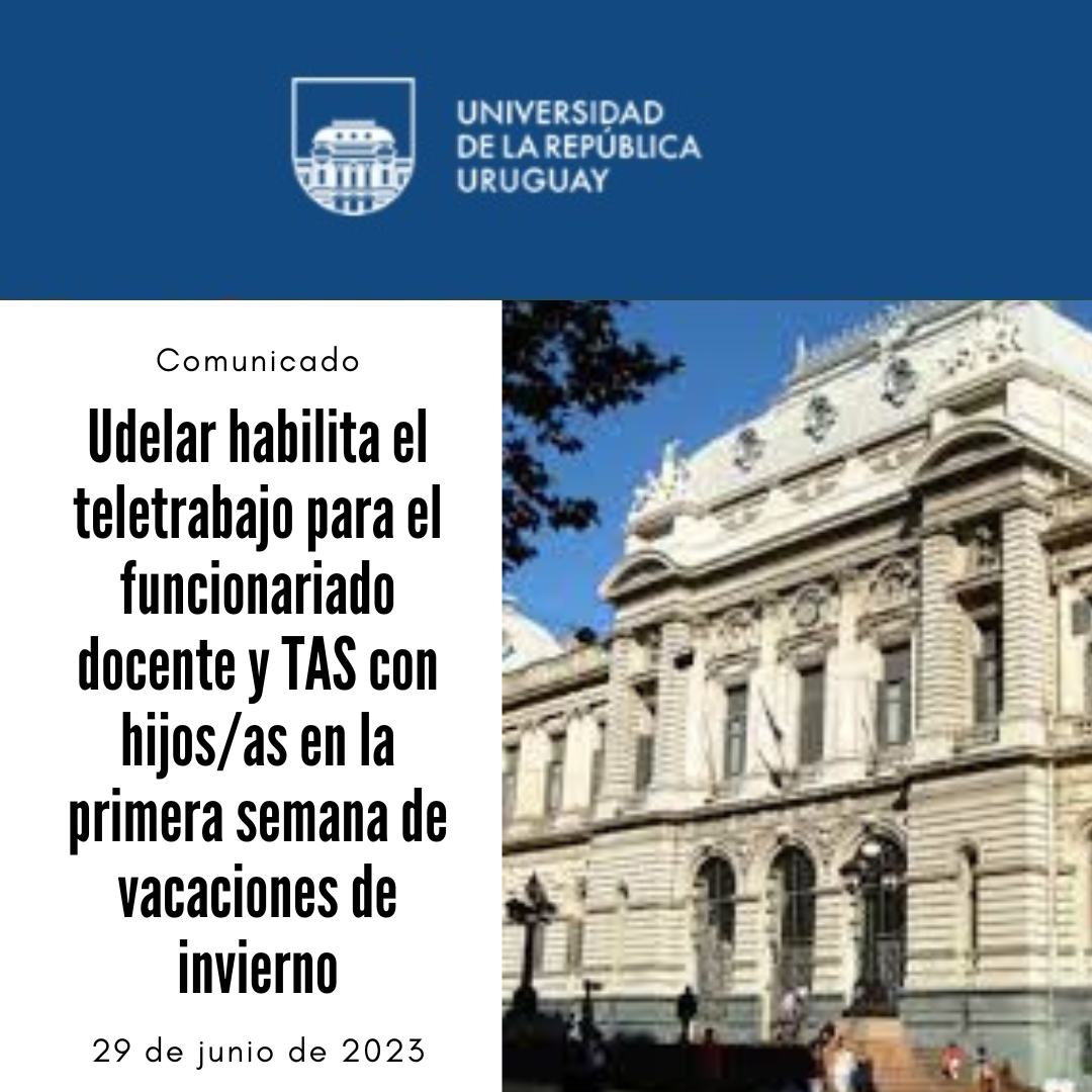 A través de un comunicado la Udelar adhiere a las pautas de funcionamiento recomendadas por el MTSS. En consecuencia, se habilita el teletrabajo para el funcionariado docente, técnico, administrativo y de servicios que son madres, padres o tutores de personas en edades comprendidas por la educación inicial y primaria; siempre que resulte viable, a pedido expreso de quien lo necesite y con la aprobación de su superior jerárquico.