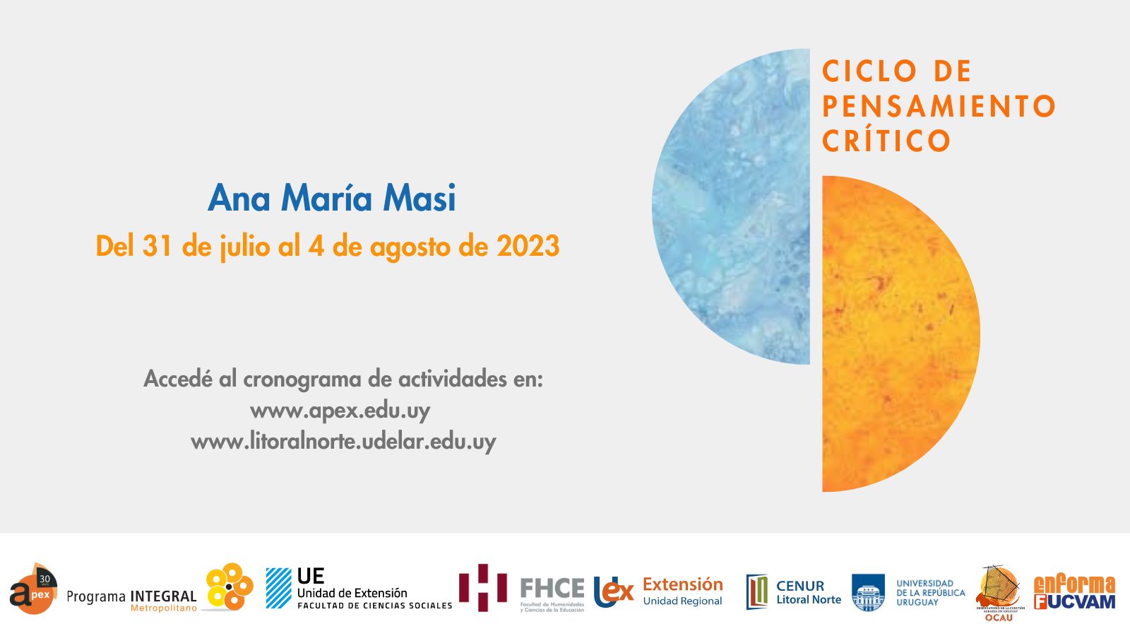 La agenda prevista para el presente módulo del Ciclo de Pensamiento Crítico, incluye el desarrollo de actividades en Montevideo, Salto y Paysandú y se concretará entre el 31 de julio y el 4 de agosto.