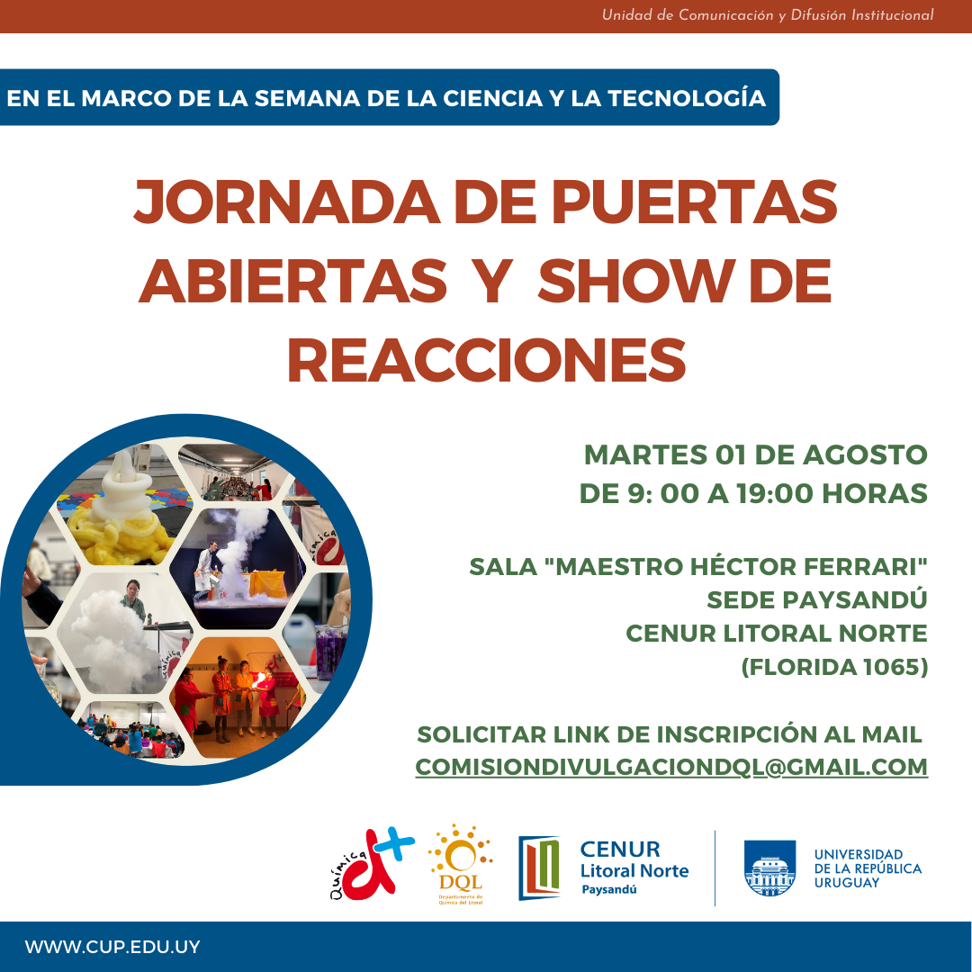 En el marco de la Semana de la Ciencia y la Tecnología, el Departamento de Química del Litoral invita a participar de una Jornada de Puertas Abiertas a realizarse el martes 01 de agosto de 9 a 19 horas en la sala "Maestro Héctor Ferrari" de la sede Paysandú (Florida1065) del Centro Universitario Regional Litoral Norte de la Universidad de la República.