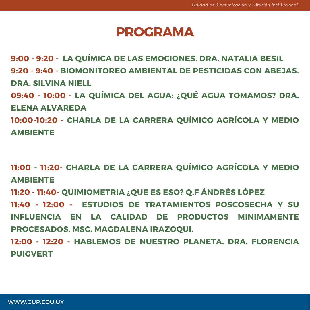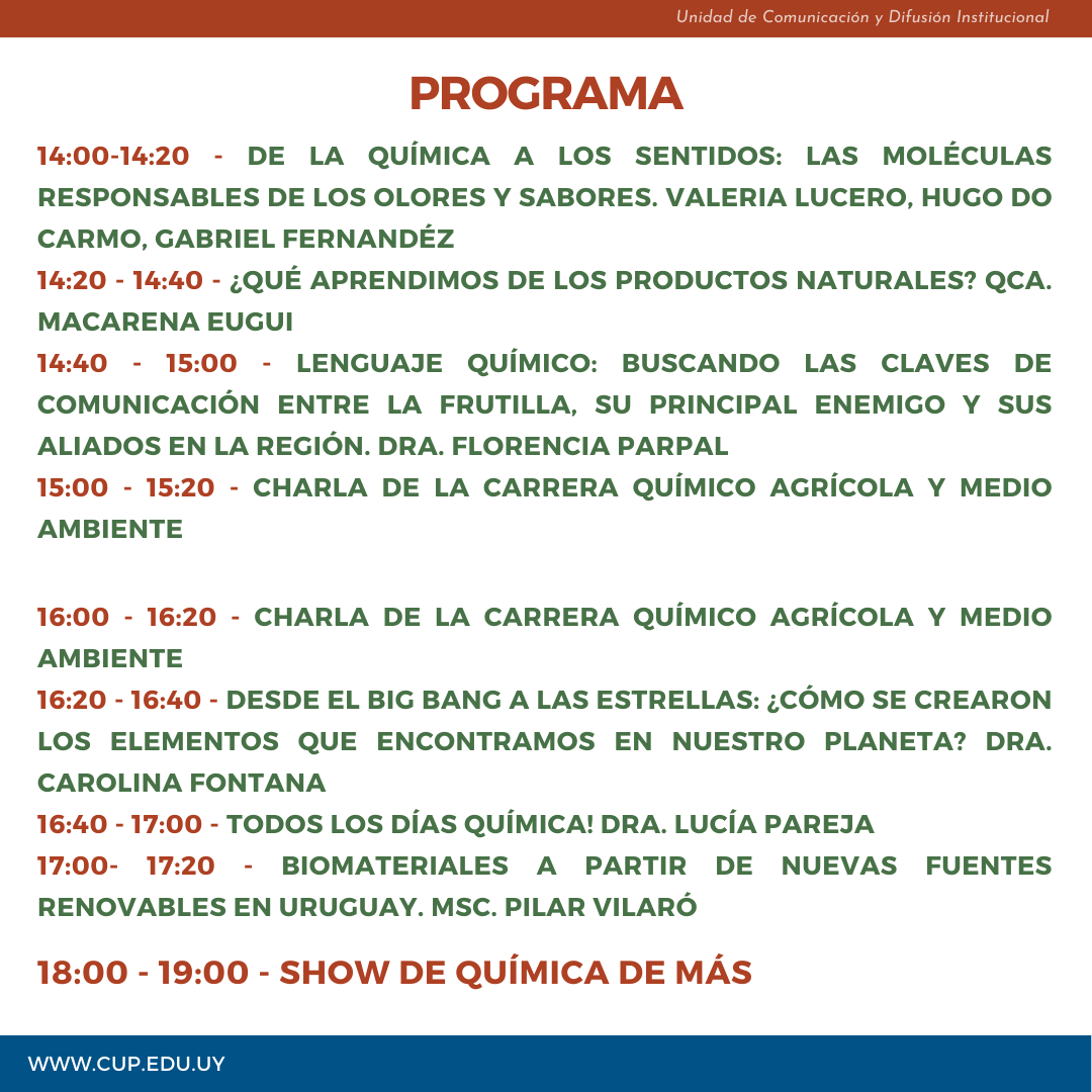 La actividad contará con instancias de divulgación de carrera y líneas de investigación del Departamento de Química del Litoral, en la Sede Paysandú y Show de reacciones de Química D+.