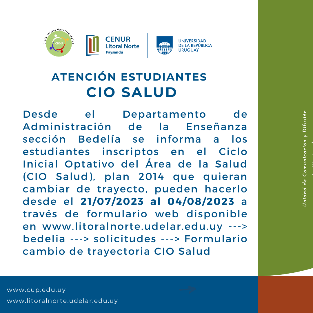 Desde el Departamento de Administración de la Enseñanza sección Bedelía se informa a los estudiantes inscriptos en el Ciclo Inicial Optativo del Área de la Salud (CIO Salud), plan 2014 que quieran cambiar de trayecto, pueden hacerlo desde el 21/07/2023 al 04/08/2023 a través del siguiente formulario: https://n9.cl/vibib