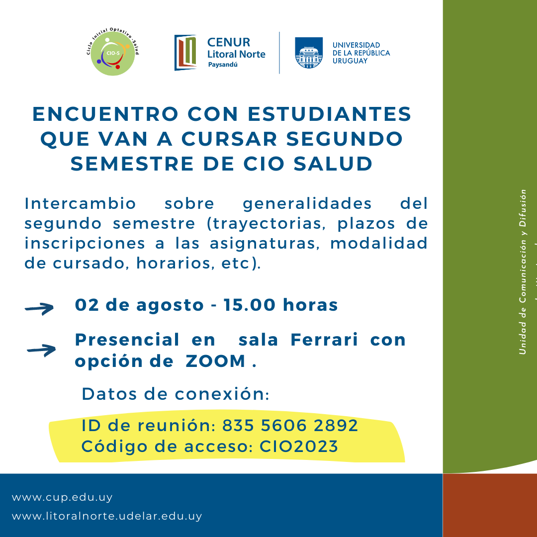 El CIO Salud de la sede Paysandú del Cenur Litoral Norte invita a todos los estudiantes que cursarán el segundo semestre de la oferta educativa a una instancia de intercambio. Durante este encuentro, se abordarán diversos temas relevantes para el próximo periodo académico, como las generalidades del segundo semestre, las trayectorias disponibles, los plazos de inscripción a las asignaturas, la modalidad de cursado, los horarios y otros aspectos relevantes para su desarrollo académico.