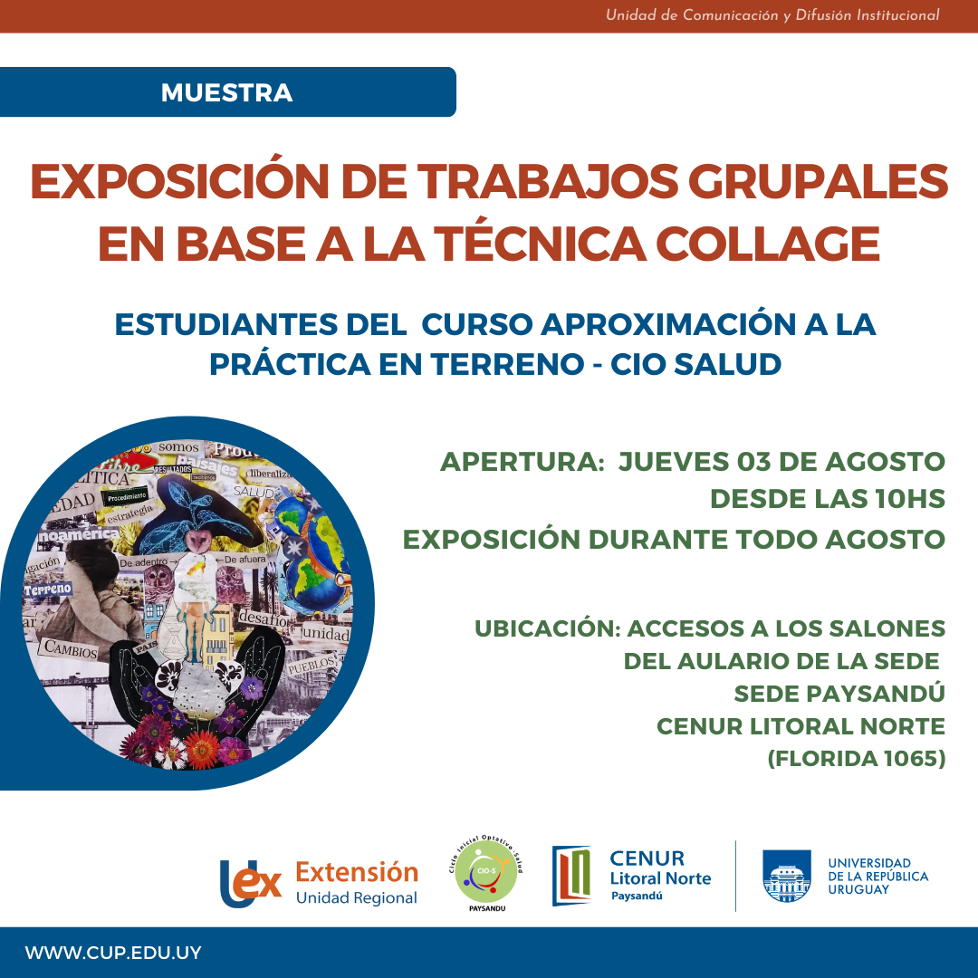 Tenemos el agrado de invitar a la comunidad universitaria a disfrutar de una interesante muestra de collages realizados por estudiantes del curso "Aproximación a la Práctica en Terreno" del Ciclo Inicial Optativo del Área Salud (CIO Salud) en la sede Paysandú del Centro Universitario Regional (Cenur) Litoral Norte de la Universidad de la República (UdelaR). Esta exposición, organizada por la Unidad Regional de Extensión, se llevará a cabo en los accesos a los salones del aulario de la sede universitaria, con apertura al público a partir del jueves 03 de agosto, a las 10horas.