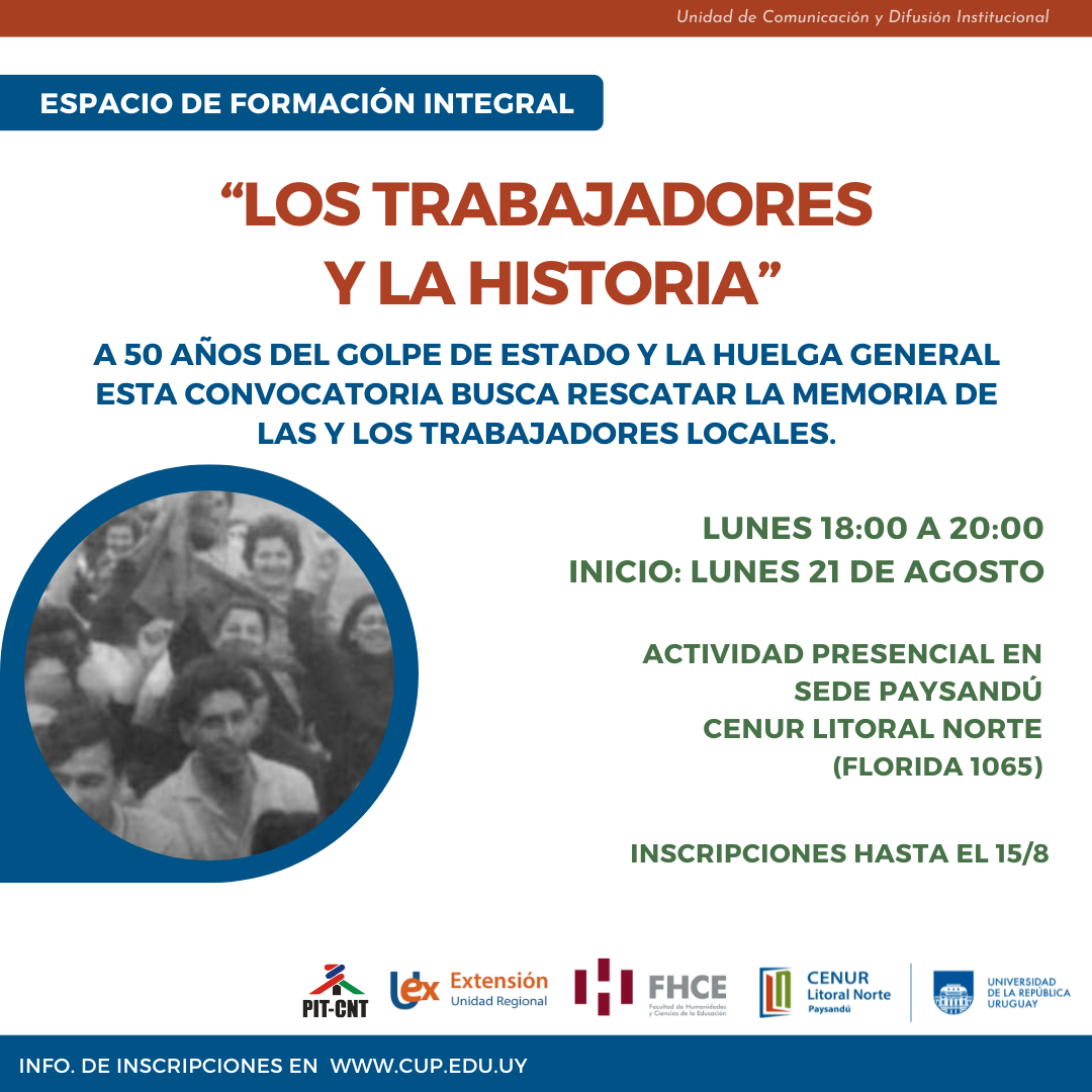 Espacio de Formación Integral “Los trabajadores y la historia” de Facultad de Humanidades y Ciencias de la Educación y Cenur Litoral Norte Sede Paysandú. A 50 años del golpe de estado y la huelga general esta convocatoria busca rescatar la memoria de las y los trabajadores locales.