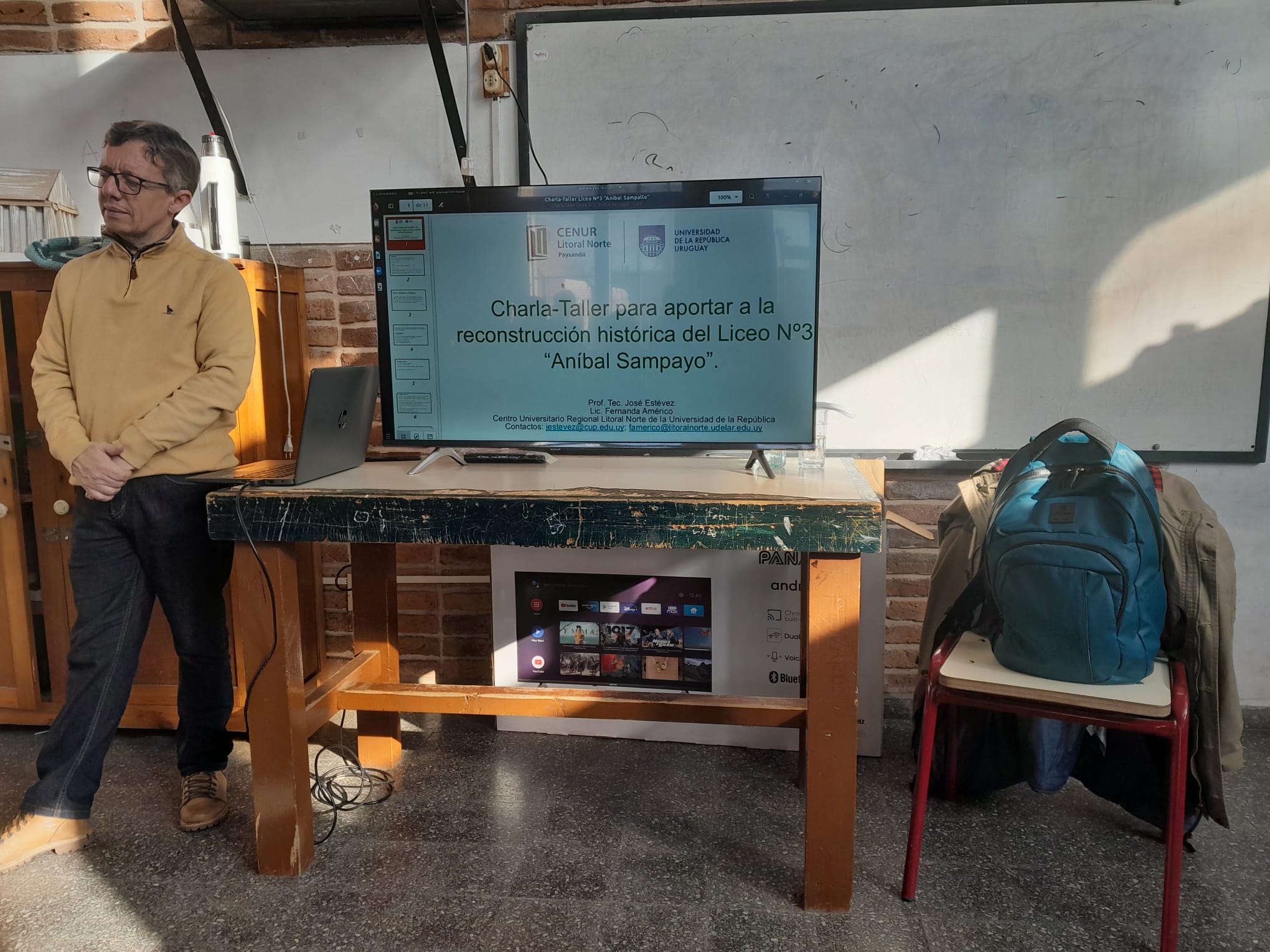 El pasado viernes 28 de julio docentes de la sede Paysandú del Centro Universitario Regional (Cenur) Litoral Norte, desarrollaron una charla-taller orientada a contribuir con la recuperación colectiva de la historia del Liceo Nº3 “Aníbal Sampayo” de la ciudad de Paysandú. Esta actividad se encuadra en un proyecto que lleva adelante una estudiante de práctica de Educación Social, en conjunto con la comunidad educativa del Liceo. En esta instancia los temas tratados fueron la sistematización de experiencias y la historia local. Participaron con gran entusiasmo de esta propuesta, estudiantes del primer año de bachillerato, profesoras y profesores del Liceo, junto a la estudiante de Práctica de Educación Social responsable del proyecto Sabrina Stevenson.