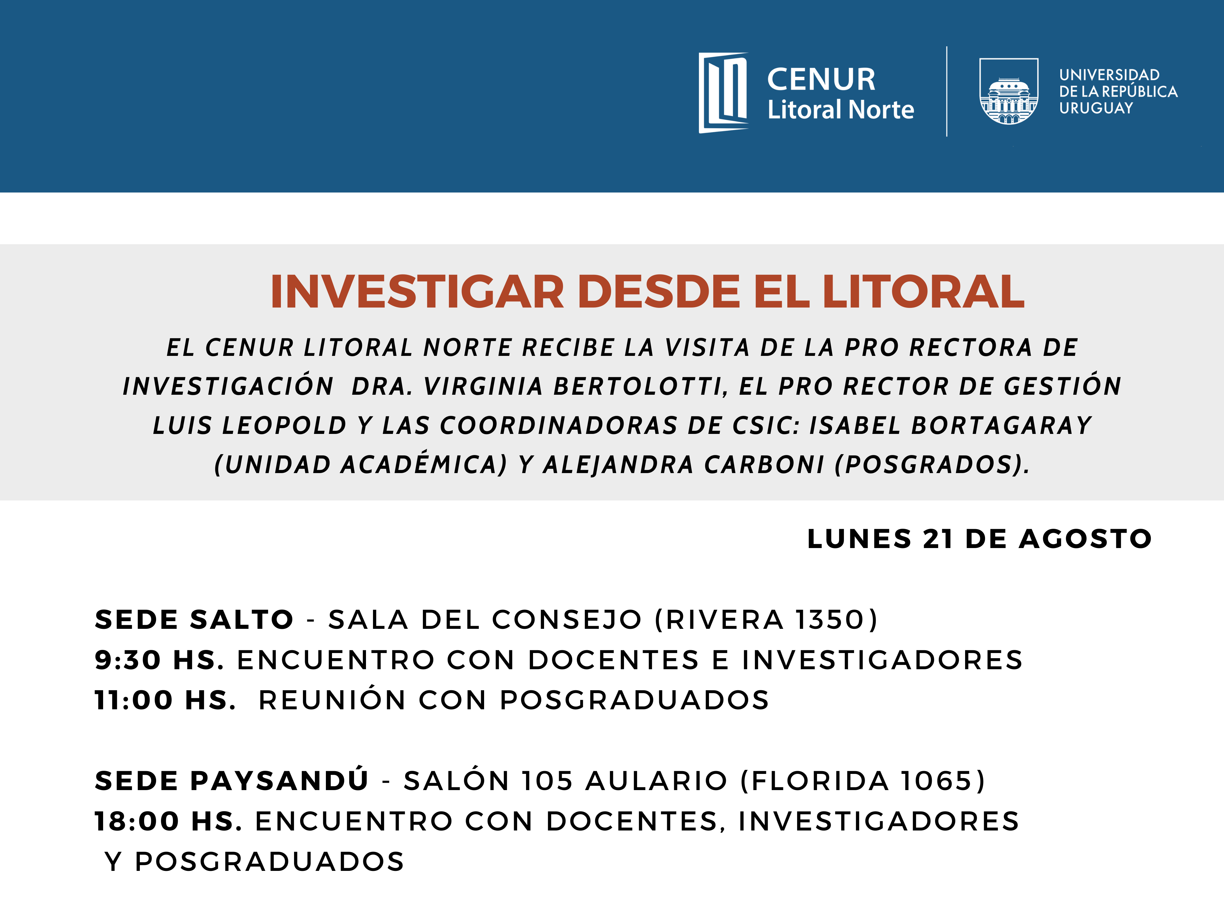 El Centro Universitario Regional (Cenur) Litoral Norte invita a docentes en general y estudiantes de posgrados a participar de las actividades enmarcadas en la visita de los pro rectores de Investigación y Gestión de la Universidad de la República a realizarse el próximo lunes 21 de agosto.
