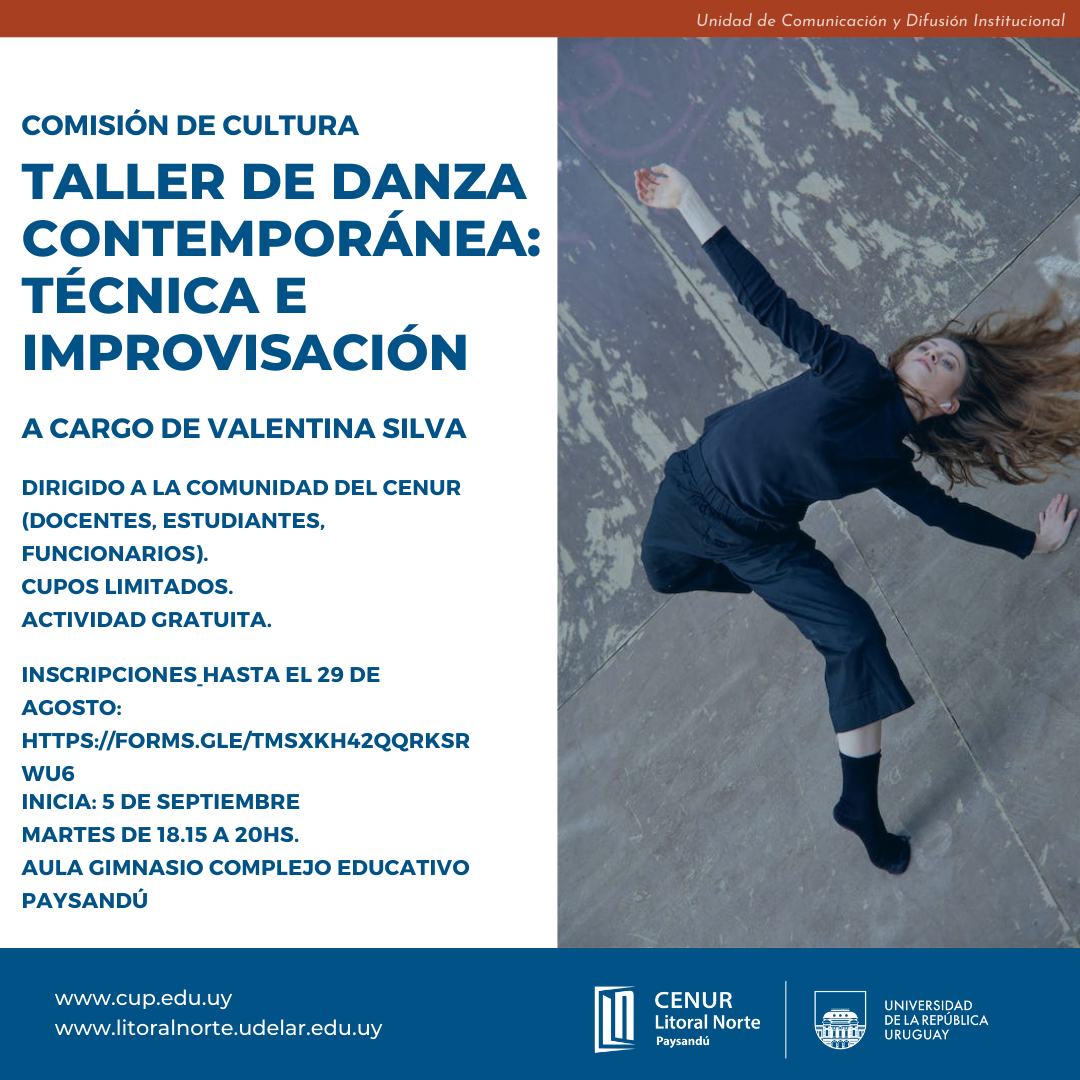 Desde la Comisión de Cultura de la sede Paysandú del Centro Universitario Regional Litoral Norte se invita a participar del Taller de danza contemporánea: técnica e improvisación. El mismo estará a cargo de la Lic. Valentina Silva. En el taller se trabajará técnica y se propondrán ejercicios propiosceptivos, con el fin de desarrollar la escucha interna del cuerpo, explorar las diversas posibilidades de los movimientos articulares. Con el apoyo de la técnica e improvisación se trabajará en la búsqueda de la danza propia de cada participante, y en la interacción entre las diversas corporalidades emergentes