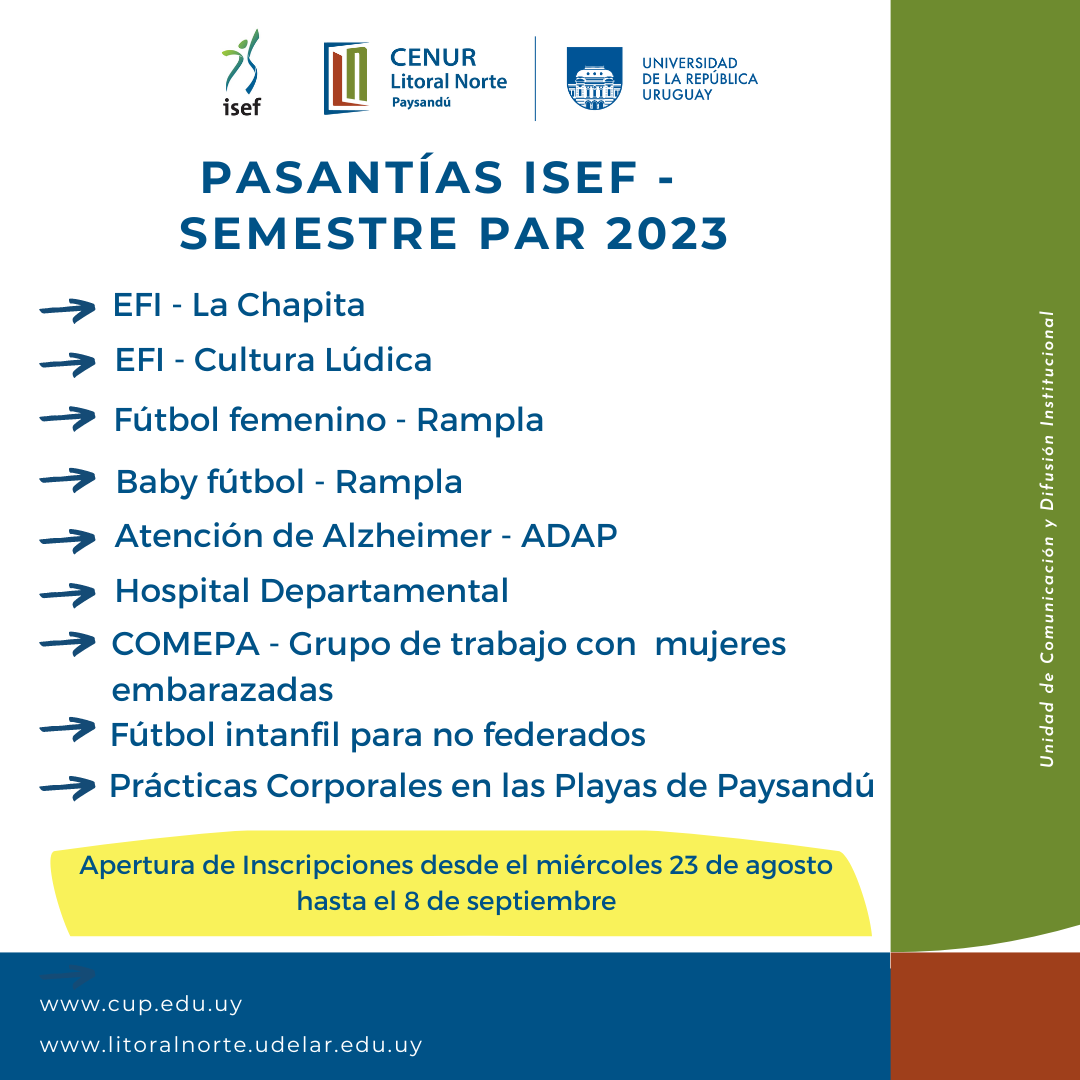 Desde el Equipo de Coordinación del Instituto Superior de Educación Física (ISEF) en la sede Paysandú del Centro Universitario Regional (Cenur) Litoral Norte se comunica la apertura de inscripciones a Pasantías institucionales del semestre par 2023.