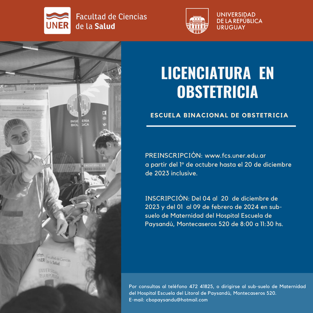 Desde el 04 de octubre hasta el 20 de diciembre de 2023 inclusive se registrarán pre inscripciones para el primer año de la carrera Licenciatura Binacional de Obstetricia que imparte la Universidad de la República - Facultad de Medicina - Escuela de Parteras junto con la Universidad de Entre Ríos - Facultad de Ciencias de la Salud.