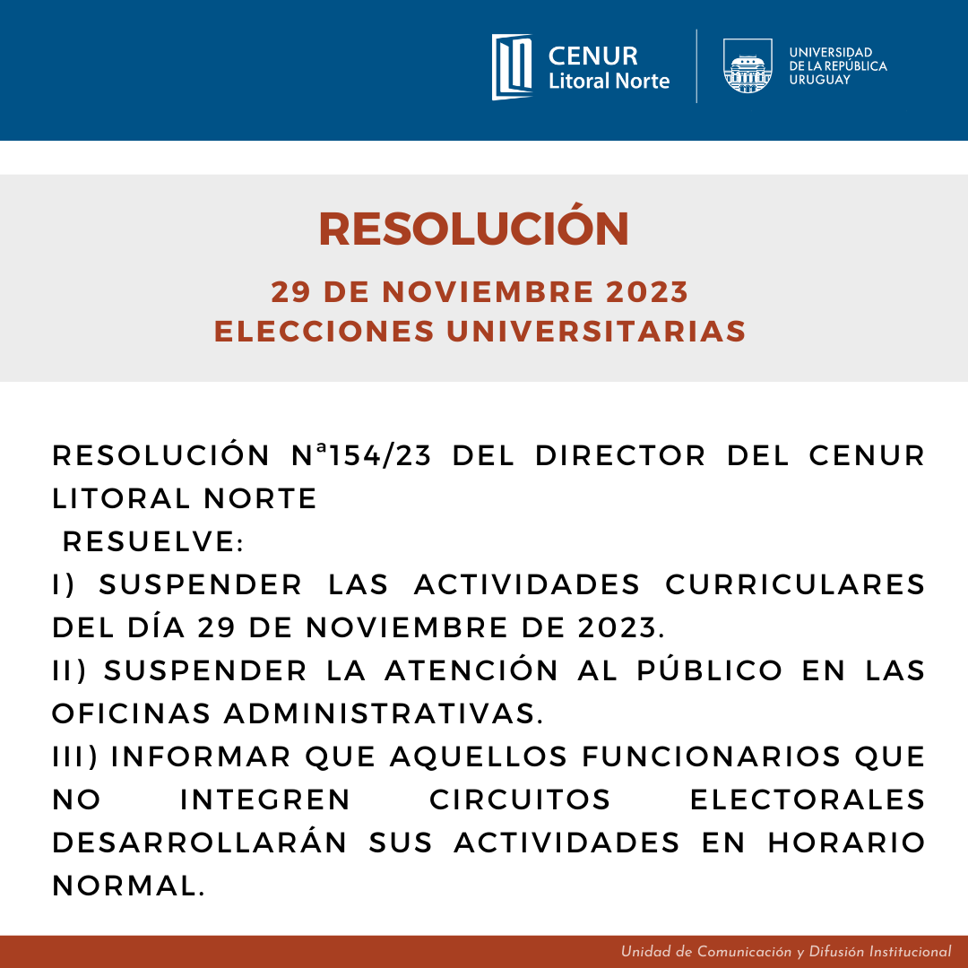 Con el objetivo de favorecer el funcionamiento de las Elecciones Universitarias del miércoles 29 de noviembre 2023, el director del Centro Universitario Regional Litoral Norte, Dr. Mauricio Cabrera, en uso de sus atribuciones ha resuelto suspender las actividades curriculares durante el día electoral como así también suspender la atención al público en las oficinas administrativas. Asimismo, se explícita en la resolución que aquellos funcionarios que no integren circuitos electorales desarrollarán sus actividades en horario normal.