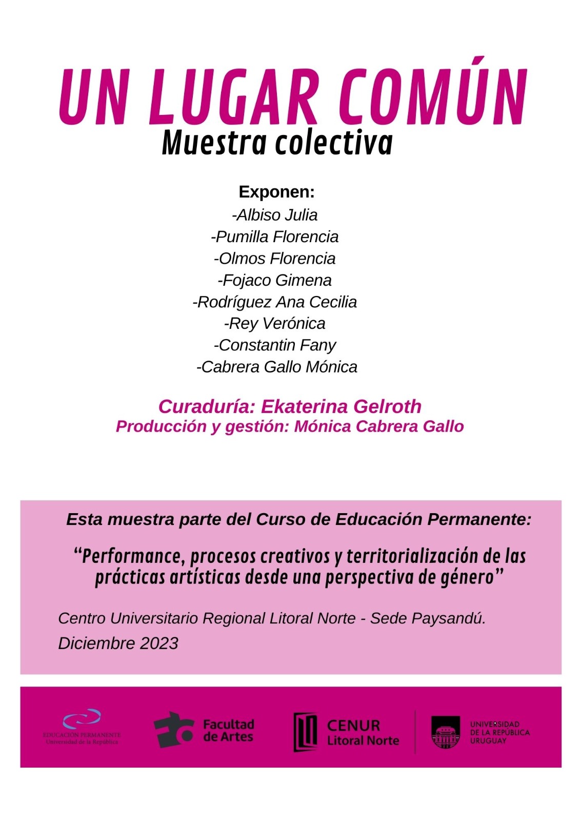En el hall del Ateneo de la sede Paysandú del Centro Universitario Regional (Cenur) está instalada y disponible para ser visitada la muestra colectiva: “Un lugar común”, montada con la curaduría de Ekaterina Gelroth y como resultado del curso de Educación Permanente “Performance, procesos creativos y territorialización de las prácticas artísticas”.