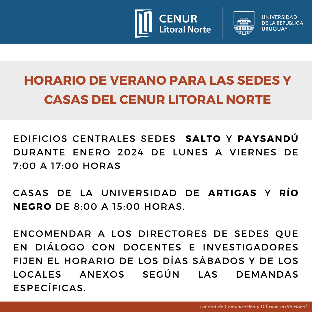 Las sedes y casas del Centro Universitario Regional (Cenur) Litoral Norte permanecerán abiertas durante enero de 2024 aunque habrá variación en los horarios y en algunas secciones no se atenderá al público.