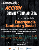 La Unidad Regional de Extensión de la Sede Paysandú del Cenur Litoral Norte, abre convocatoria a estudiantes, docentes, egresadas/os y funcionarias/os de la sede universitaria de Paysandú a conformar un grupo de trabajo en el marco de las acciones territoriales que se vienen desarrollando en el escenario actual de emergencia sanitaria y social.